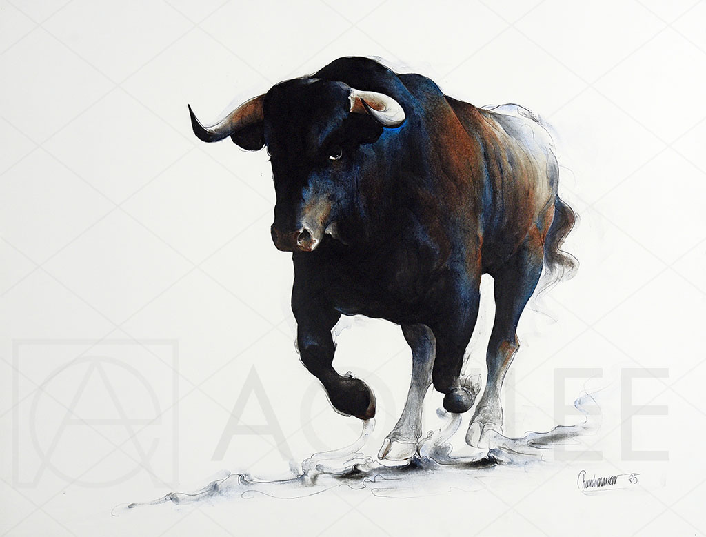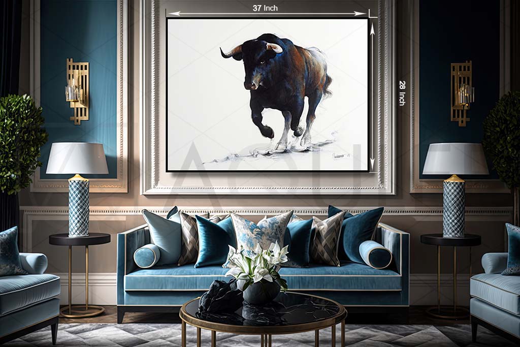 A vibrant painting depicting a bull running across the ground, showcasing its strength and dynamic movement.