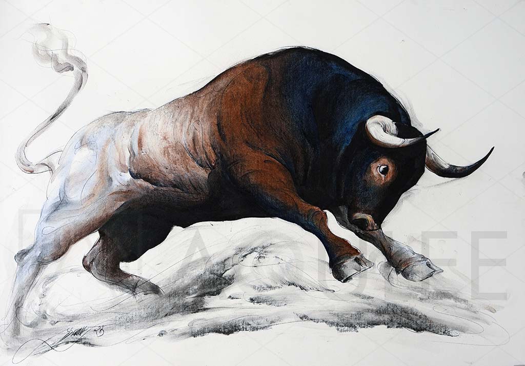 A drawing of a bull running energetically across the ground, showcasing its powerful legs and muscular build.