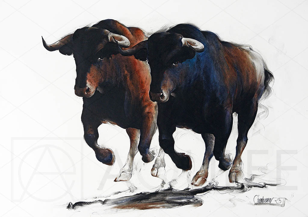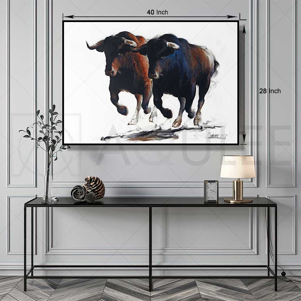 Two bulls gallop energetically across a vibrant painting, showcasing their strength and movement in a dynamic scene.