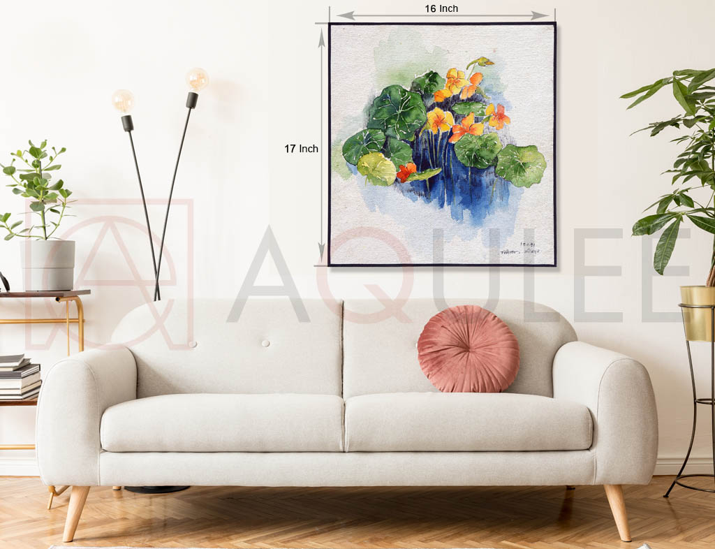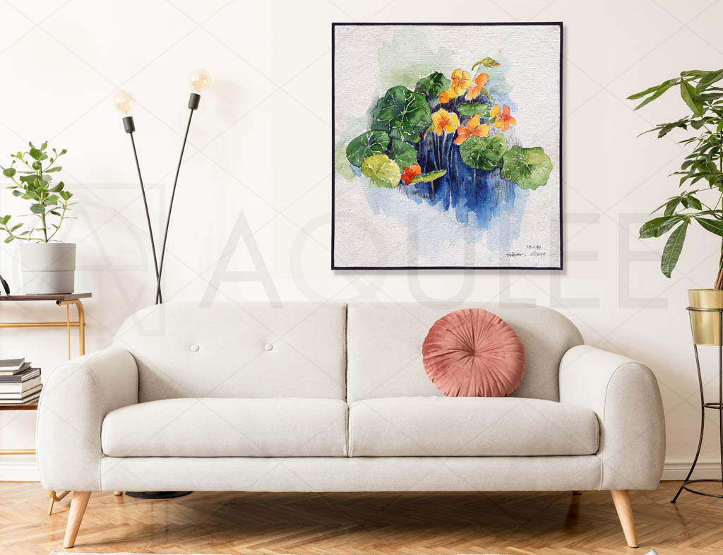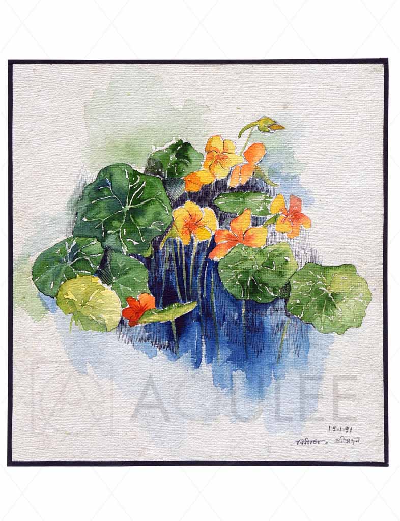 Description :- Watercolor artwork featuring orange and yellow flowers gracefully resting in a calm pond.