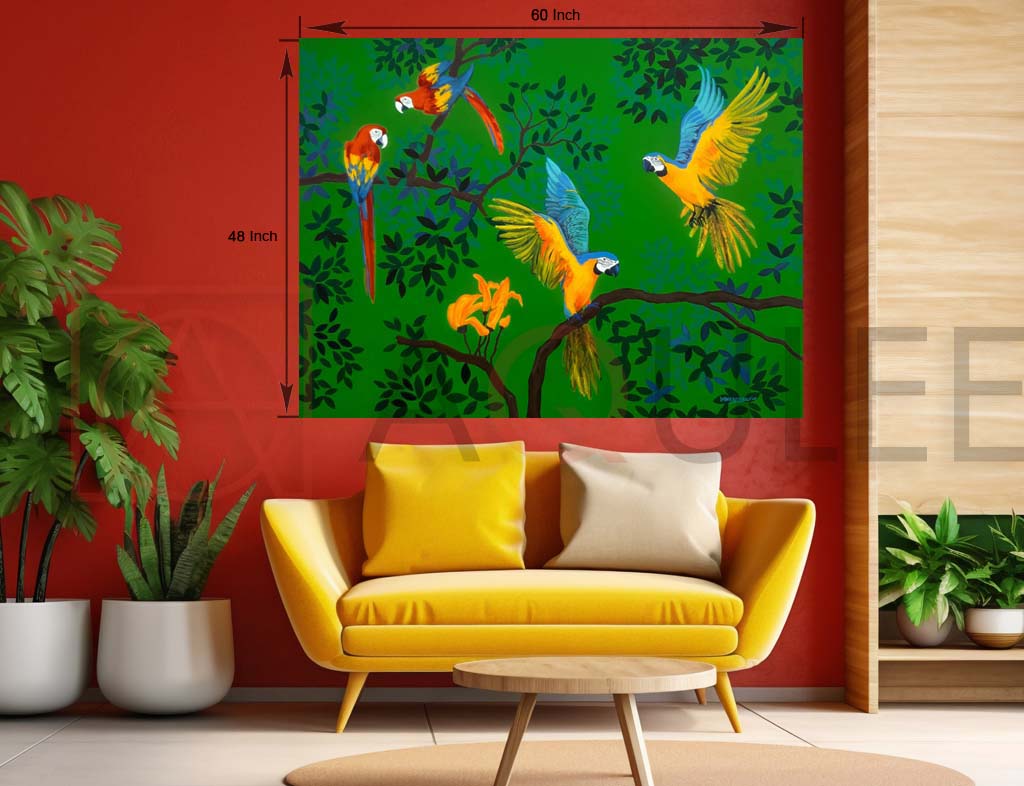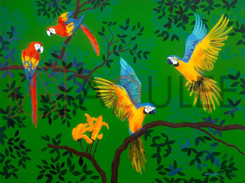 DESCRIPTION : A lively artwork featuring parrots in various colors set on a bright green backdrop.
